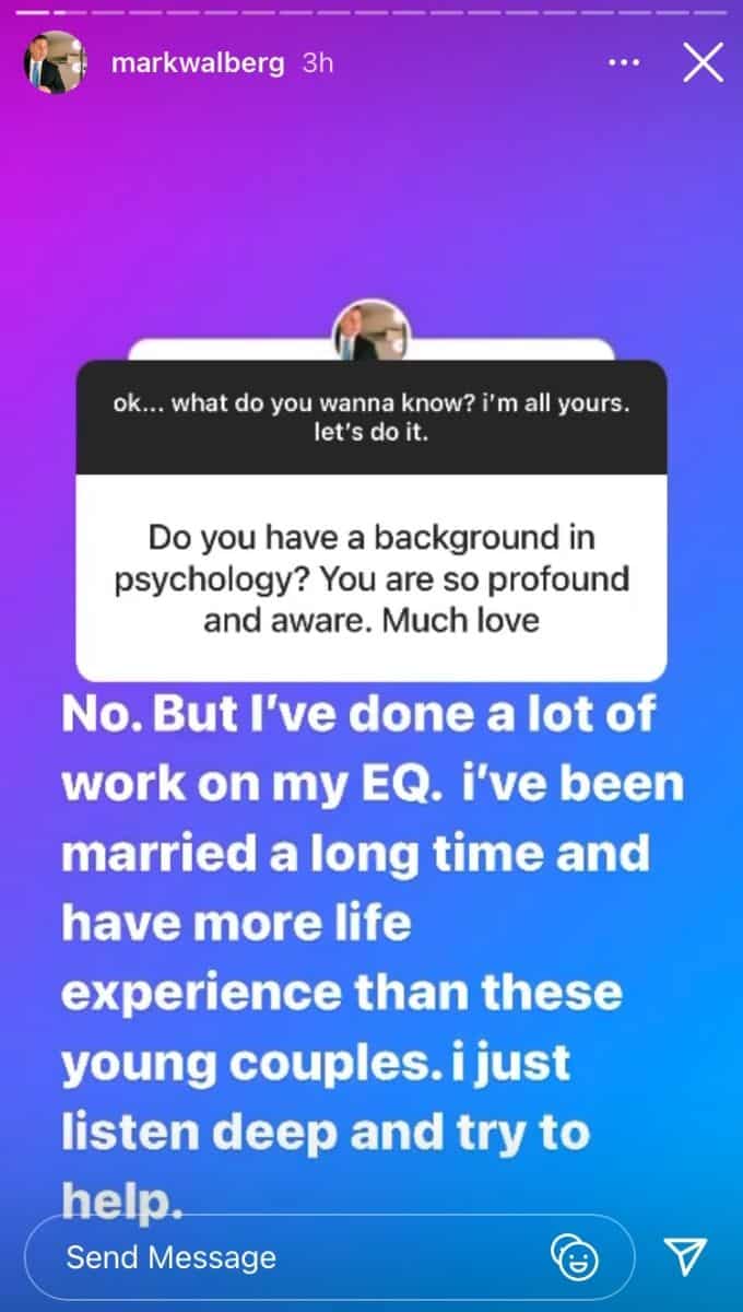 Fans on IG were curious to know if Mark has a background in psychology since he comes off as profound and aware during the bonfires with the cast. To answer the fan question Mark wrote, “No. But I’ve done a lot of work on my EQ (emotional intelligence). I’ve been married a long time and have more life experience than these young couples. I just listen deep and try to help.”